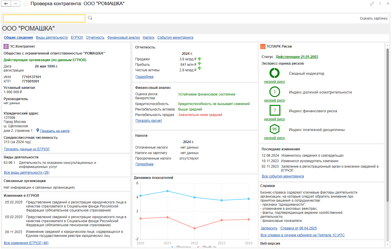 Для еще более детального анализа и проверки рекомендуем приобрести тариф "1СПАРК Риски +". Вы сможете получать заверенные справки о контрагентах, а также получите доступ к подробной информации о контрагенте в веб-версии "СПАРК-Интерфакс": регистрационные данные, структура собственников и дочерних компаний, анализ взаимосвязей, активы компании, подробный анализ платежной дисциплины, финансы и другая информация, которая поможет минимизировать финансовые и налоговые риски.